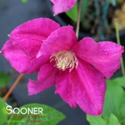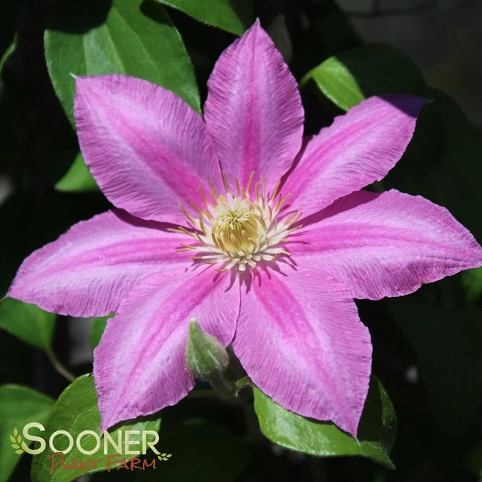 Buy Abilene™ Clematis online. Abilene™ Clematis is a delightful pink flower with contrasting yellow anthers. As the flowers mature, a central deep pink stripe becomes more prominent along the center of the petal. This is an excellent new and unique introduction into the clematis genus.