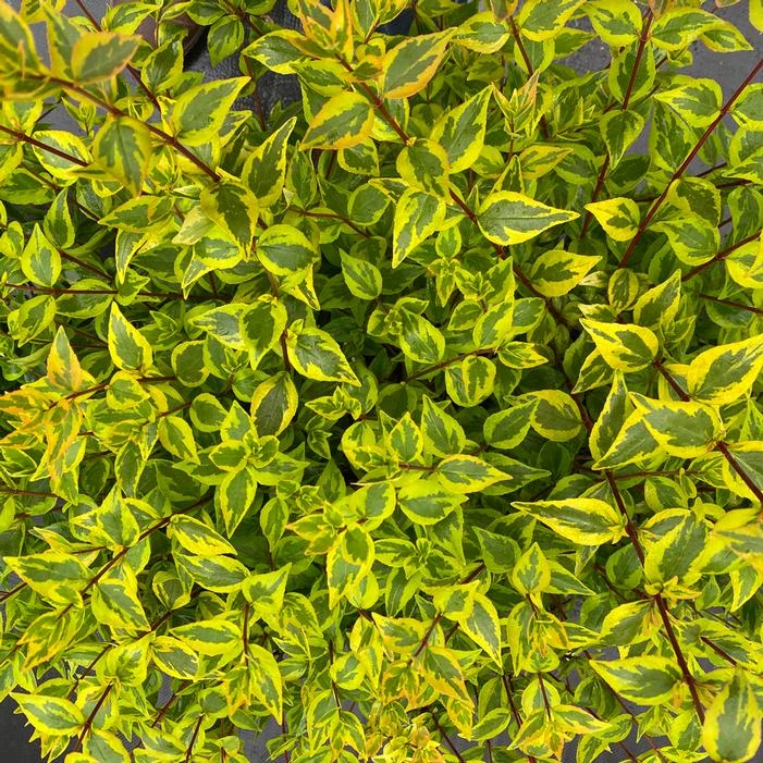 Buy Brilliantina™ Abelia online. Brilliantina™ Abelia has a neat, dense habit that’s much less prone to wild shoots sticking up out of the bush, which means it needs less pruning both in production and the landscape. Its green, yellow, and orange foliage is also less likely to revert than other variegated cultivars of abelia. Dark red stems add a surprising amount of color and contrast, and white summer flowers bring fragrance and pollinators.