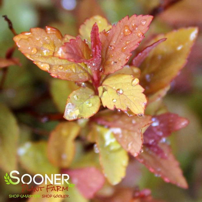 Buy Goldflame Spiraea online. Bronzy-gold to soft yellow foliage covers this compact, dense growing shrub followed by rich crimson-red flower clusters in fall. This shrub ideal for borders or low hedges.