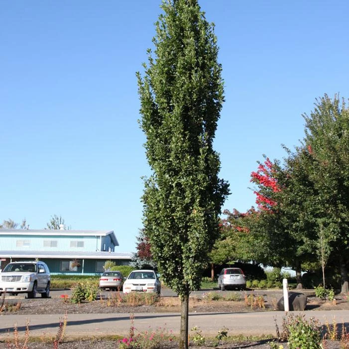 Buy Skinny Genes® Oak online. Skinny Genes® Oak was selected by J. Frank Schmidt & Son, Co. out of seedlings from Crimson Spire™ Oak. Its claim to fame is that it’s the most narrow and columnar growing of their hybrid oak selections. The leaves are a dark glossy green, and turn golden yellow in fall. The leaves remain all winter until they’re pushed off by new growth in the spring. An excellent tree for privacy, shade, specimen plantings, and wind breaks.