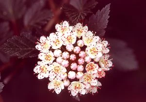 Buy Summer Wine® Ninebark online. Summer Wine® Ninebark is a cross between Physocarpus opulifolius ‘Nana’ and Diabolo™ Ninebark. Summer Wine® Ninebark is a neat compact grower, with nice clean deeply cut foliage. The dark maroon leaves, will contrast well in any garden. This strong grower requires little pruning, making this a spectacular shrub. Flowers are pinkish-white and value-like. Excellent contrast plant against a light colored background, or mixed with yellow and bright green plants. Extremely hardy!